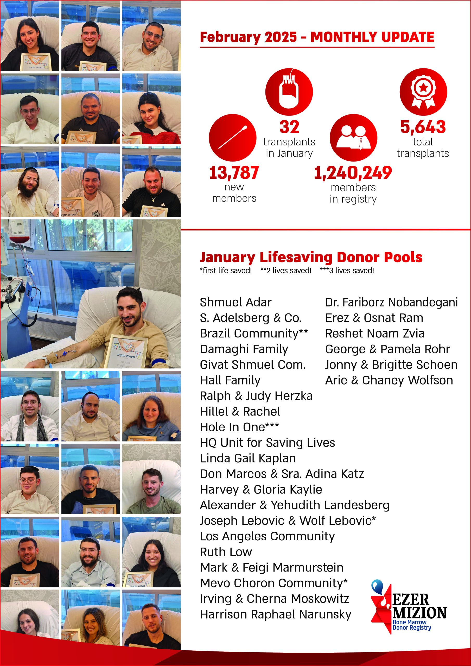 F 13,787new members this month1,240,249 total members in registryTransplant CountriesArgentina, France, Germany, Israel, Italy, Netherlands, Portugal, Spain, UK, USA Alexander & Yehudit LandesbergArie & Chaney Wolfsonbone marrowbone marrow registrybone marrow transplantBrazil CommunitycancerDamaghi FamilyDon Marcos & SraDR FARIBORZ NABANDEGANIErez & Osnat RamGeorge & Pamela RohrGivat Shmuel CommunityHall Familyharrison Raphael NarunskyHarvey & Gloria KaylieHillel & RachelHole in OneHQ Unit for Saving LivesIrving & Cherna MoskowitzIsraelJewishJonny & Brigitte SchoenJOSEPH LEBOVIC & WOLF LEBOVICLinda Gail KaplanLos Angeles CommunityMark & Feigi MarmursteinMEVO CHORON COMMUNITYRalph & Judy HerzkaReshet Noam ZviaRuth LowS. Adelsberg & Co.Shmuel Adar By Ezer MizionFebruary 11, 2025Bone Marrow Registry, Bone Marrow Registry Updates